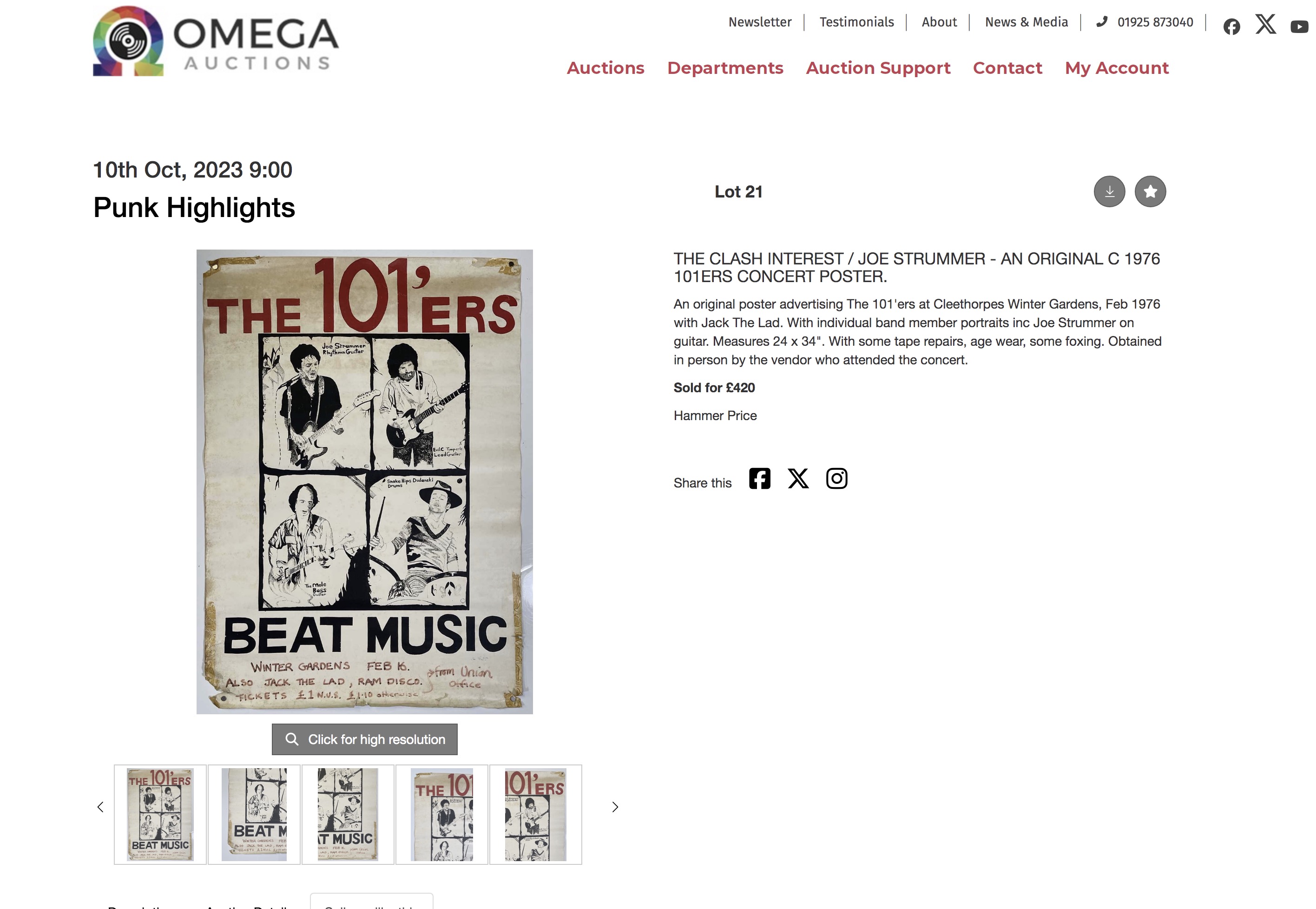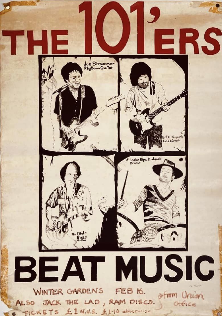 An original poster advertising The 101'ers at Cleethorpes Winter Gardens, Feb 1976 with Jack The Lad. With individual band member portraits inc Joe Strummer on guitar. Measures 24 x 34". With some tape repairs, age wear, some foxing. Obtained in person by the vendor who attended the concert.