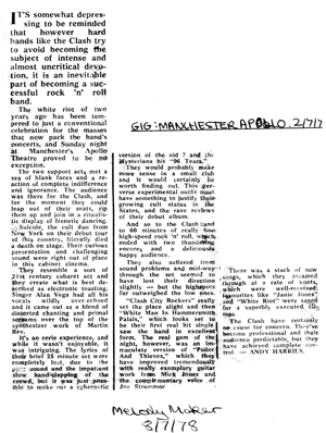The footage shows the Apollo crowd going crazy and the band leaping around the stage. Joe jumps down into the deep pit created between stage and audience before being pulled up by Mick and Joe. The video sound is not lip-synched and is only of a reasonable audience sound. Play the video, read the comments here, The Clash | Facebook or here, The Clash Official | Facebook