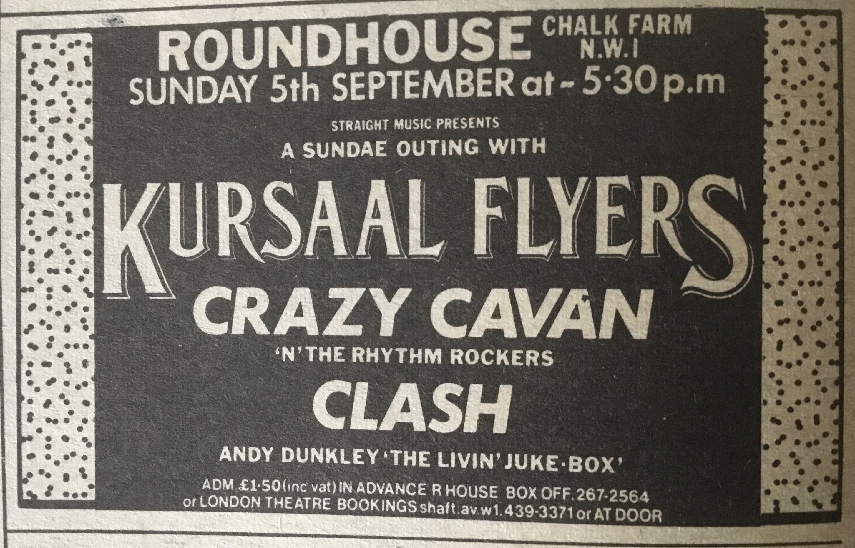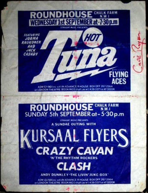 A gig on 5 September at one of the Roundhouse’s Sunday sessions proved to be Keith Levene’s last. The Clash were third on the bill supporting pub-rockers the Kursaal Flyers and rock ’n’ roll revivalists Crazy Cavan & The Rhythm Rockers. Playing inhumanly early to just-arrived hippies, The Clash were greeted with a luke- warm response and asmattering of heckling.