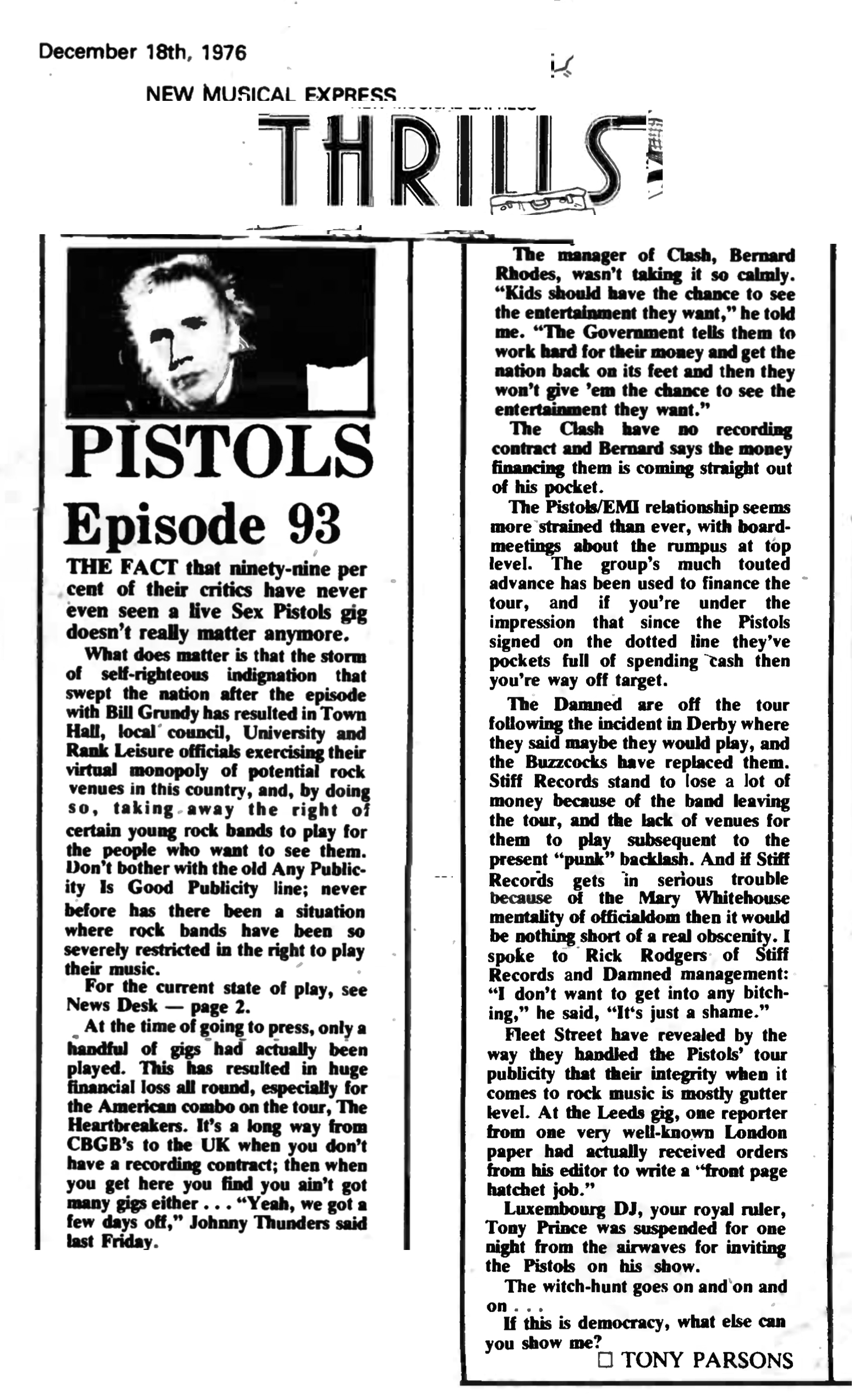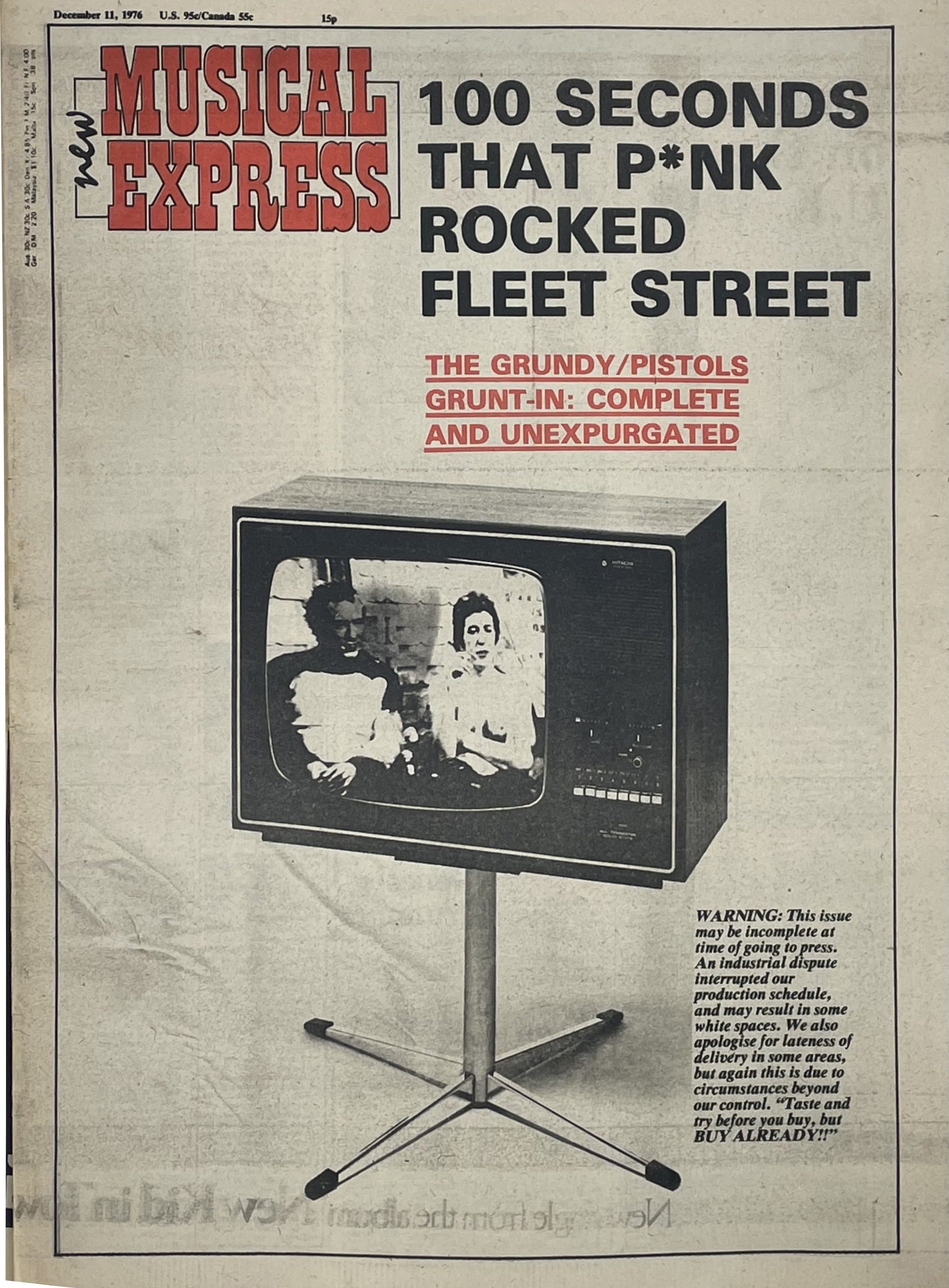 — Main story reproduces the notorious Thames TVToday interview of Dec. 1, 1976, where Bill Grundy provoked the Sex Pistols that shocked Britain and brought punk into national focus.