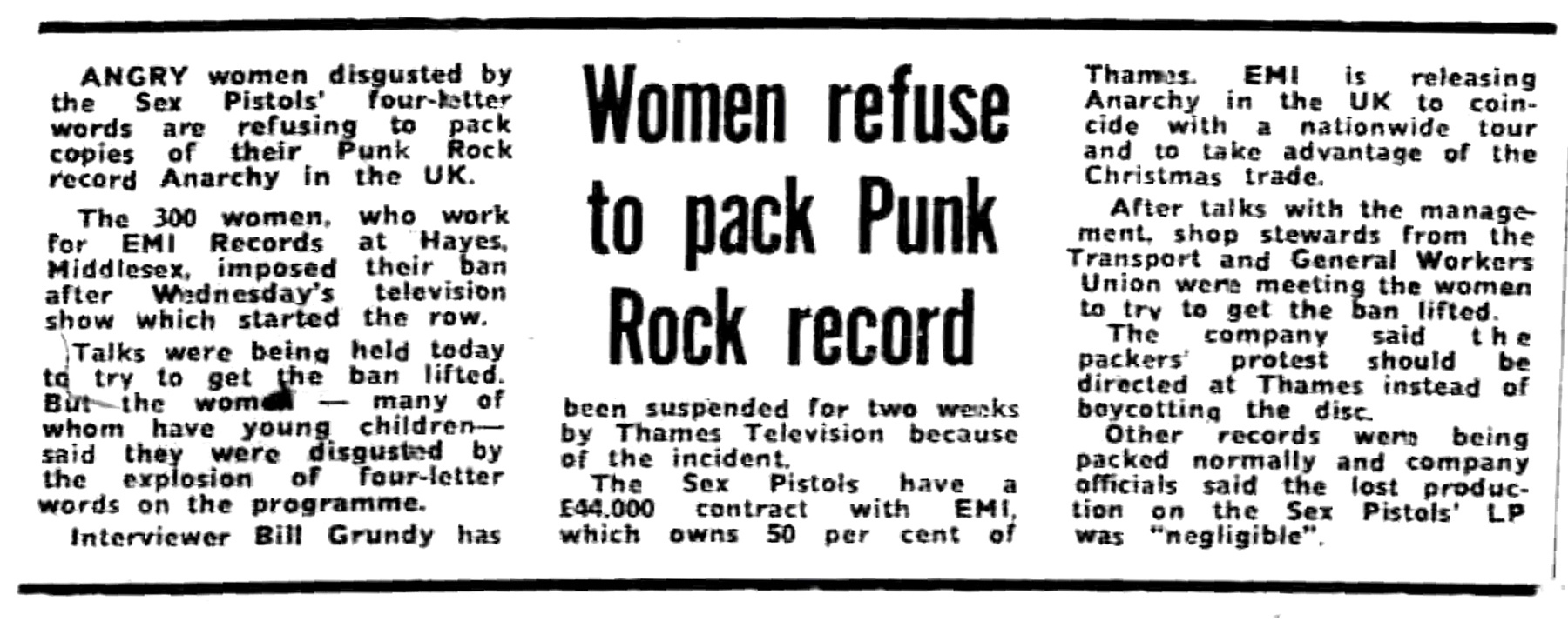 ANGRY women disgusted by the Sex Pistols' four-ketter words are refusing to pack copies of their Punk Rock record Anarchy in the UK.