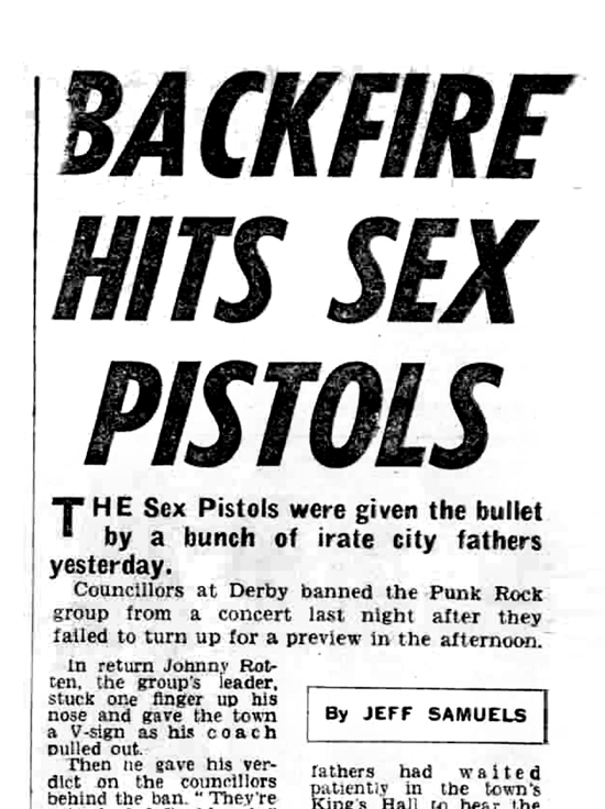 The Pistols burst into the limelight with their foul-mouthed replies to TV interviewer Bill Grundy last week. Yesterday they learned that their Boxing Day concert at Harlesden, North West London had been cancelled.