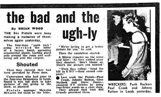 "Concerts for the Sex Pistols were cancelled and interviewer Bill Grundy was suspended last night in a row over the group's four-letter outburst on TV." - Enlarge image