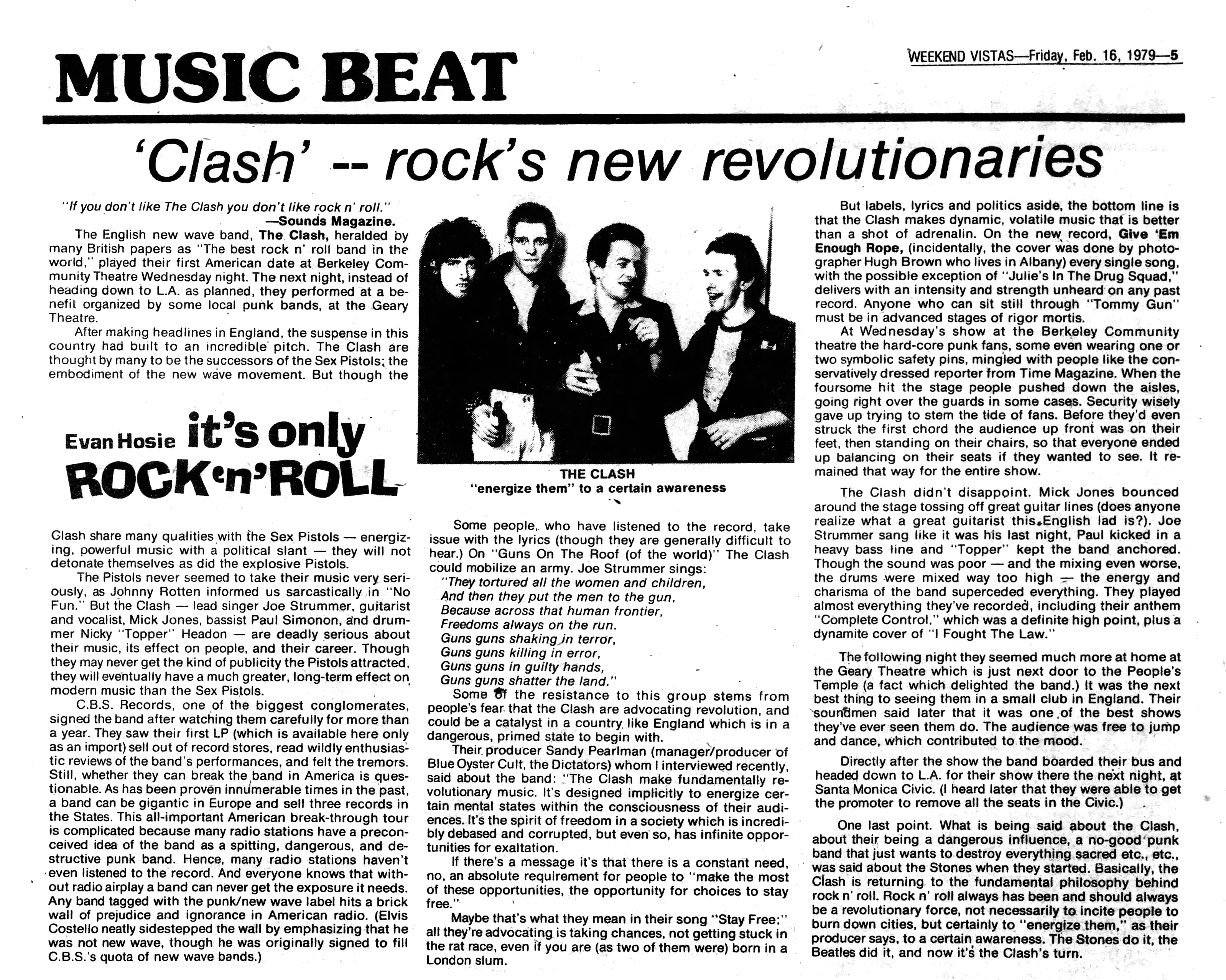 The Clash played their first show in the US on February 7, 1979 at the Berkeley Community Theater. Bo Diddley opened for The Clash that night. On the following night, February 8th, The Clash played a benefit gig at for New Yooth in the Fillmore.