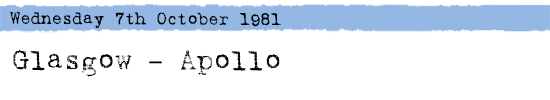 Whoever wrote the 'Punter's View' for the Clash Glasgow Apollo gig on the 7 October 1981 got it totally spot on! I was in the circle or balcony for that one with my cousin. We'd come down from Aberdeen to see it during my Fresher's Week at Aberdeen University. The Theatre of Hate who supported were a late announcement, and had dragged a lot of the hard-core punks in to a Clash gig despite accusations at the time from the hard-core community that the Clash had sold out.