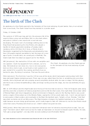 Although damning rock stereotypes, Theclassic group that none of their contemporaries could match. A frighteningly new and dangerous version of the old rock formula, which had come along almost by accident. I emerged from that meeting uplifted and elated. I could have said that I had just met the future of rock 'n' roll, if that phrase hadn't just been abused with Bruce Springsteen. I went home and got out one of my white shirts. Fished out a tub of paint and splashed it all over with a glaring red CLASH. Trouble is, I used gloss. It wouldn't dry, stank like hell and stood up on its own afterwards. I still wore it with pride though.