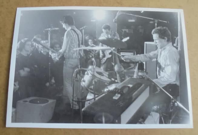 Bob Simmons stood riveted to the spot, rigid and tense, Fender Mustang guitar slung high up his chest like a young Wilko Johnson. Paul Myers, curling his lip nervously, stood motionless staring blankly, focusing on his bass-lines. Paul Smith ploughed his way through the five numbers using snare and tom-toms, still unable to incorporate the hi-hat into his playing. Vic Goddard slouched, hanging on the mic, a tortured yet expressionless air, his face highlighted by the white makeup he had applied, ignoring the audience with complete indifference.
