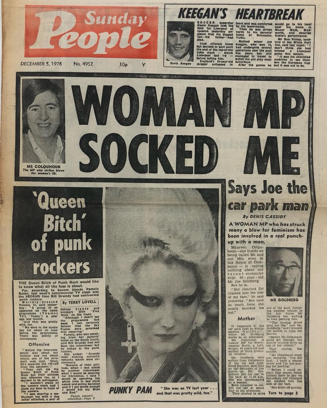Sunday People from 1976. 'Queen Bitch' of the punk scene Jordan holds her own on the front page a week after the notorious Bill Grundy ëpunk rock shockerí interview. Nearly 50 years on her attitude seems remarkably contemporary compared to the media coverage of the time.