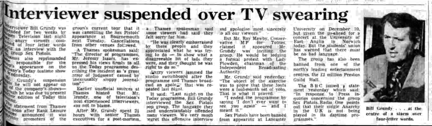 Interviewer Bill Grundy was suspended for two weeks by Thames Television last night angry viewers complained of four letter words during an interview with the group Sex Pistols.