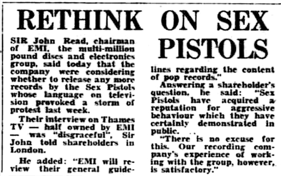 Sex Pistols could lose their record contract if they continue to say nasty words in public but they would probably be able to keep the £40,000 cash from entertainment giant EMI. Describing last week's Thames TV interview with the punk rock group as "disgraceful,"EMI chairman Sir John Read said yesterday his company would decide within a week whether or not to break the £40,000 contract granted the group. Earlier, Sir John had told 150 shareholders who passed an elaborate security check to gain admittance to EMI's annual meeting that Sex Pistols were the only punk rock group under a direct recording contract with EMI, and whether any more of their records were released would have to be very carefully considered. On the profit scene, Sir John reaffirmed his annual report prediction of further progress.