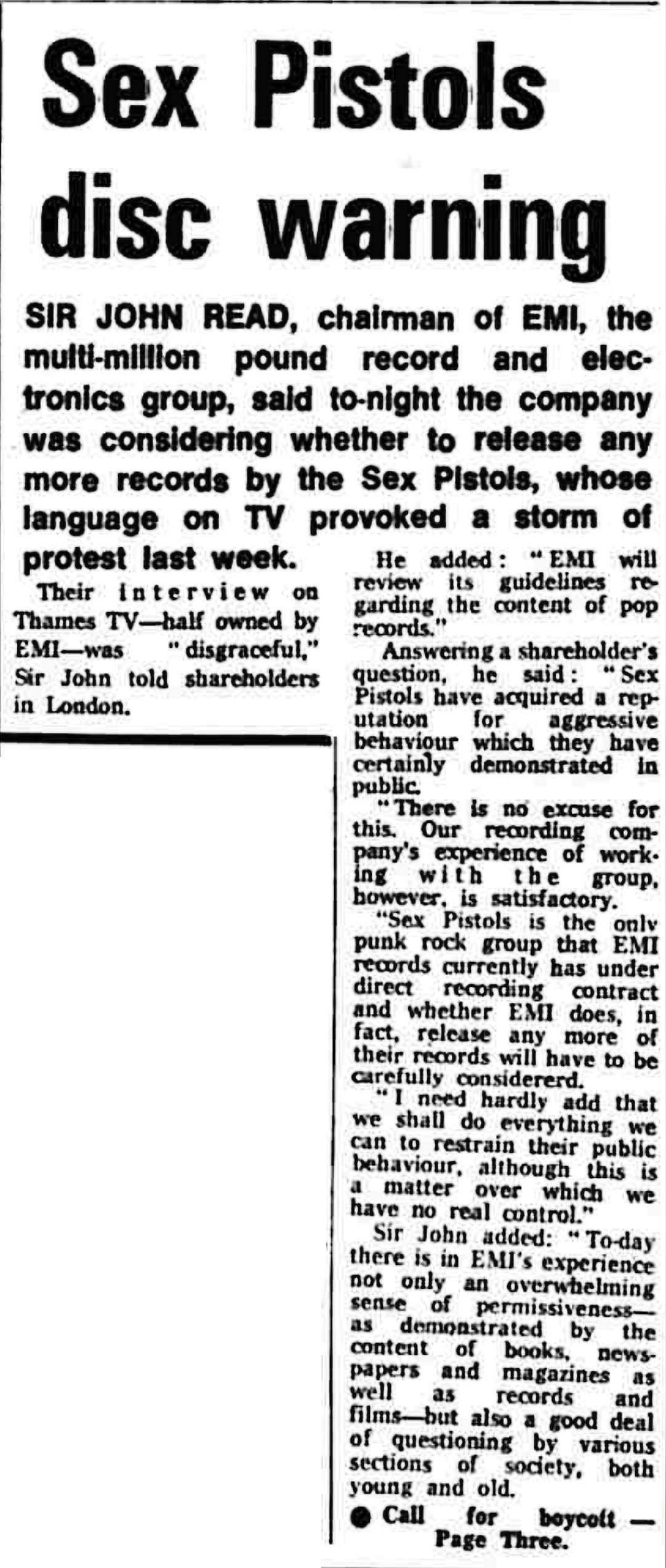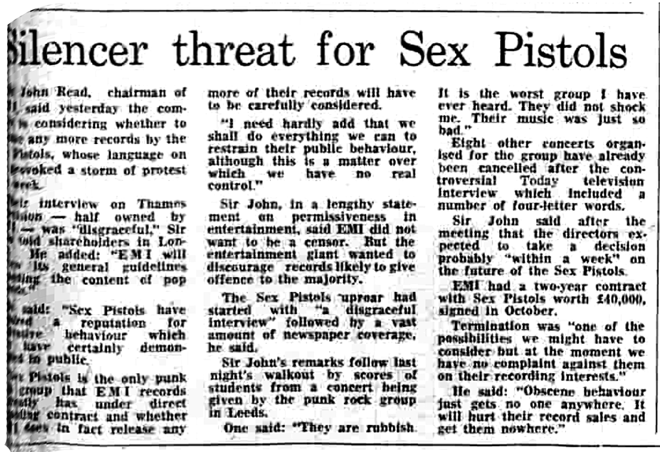 Sex Pistols, Britain's most notorious punk rock group, could lose their record contract if they continue to say nasty words in public. But they would probably be able to keep £40,000 already pledged to them by the entertainment giant EMI. Sir John Read, EMI's chairman, said the television interview given to Sex Pistols last week was "disgraceful" and his company would decide within a week whether or not to break the contract. Earlier Sir John had told shareholders, who had passed an elaborate security check to gain admittance to the EMI annual meeting in London, that Sex Pistols was the only punk rock group under a direct recording contract with EMI Records. Whether any more of their records were released would have to be carefully considered.
