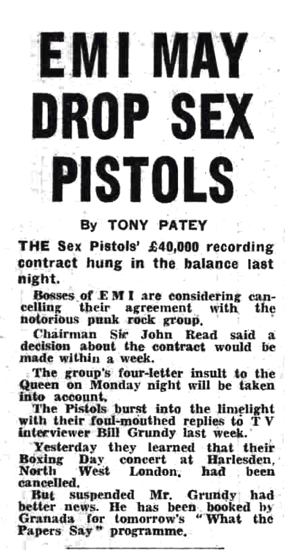 The Pistols burst into the limelight with their foul-mouthed replies to TV interviewer Bill Grundy last week. Yesterday they learned that their Boxing Day concert at Harlesden, North West London had been cancelled.