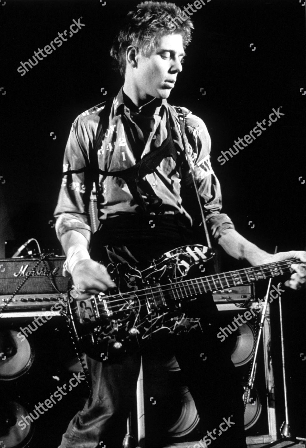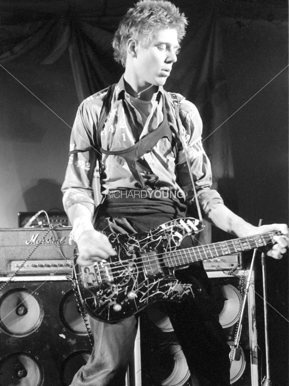 If Johnny was uncharacteristically quiescent, the others almost made up for it. Glen Matlock seemed to be playing his bass in a blur of knee jumps. Steve Jones practised calisthenics between savaging his guitar — he's beginning to justify the legend Guitar Hero sprayed on his amp. And Paul Cook kept right in there with his solid drumming and torn porno T-shirt.