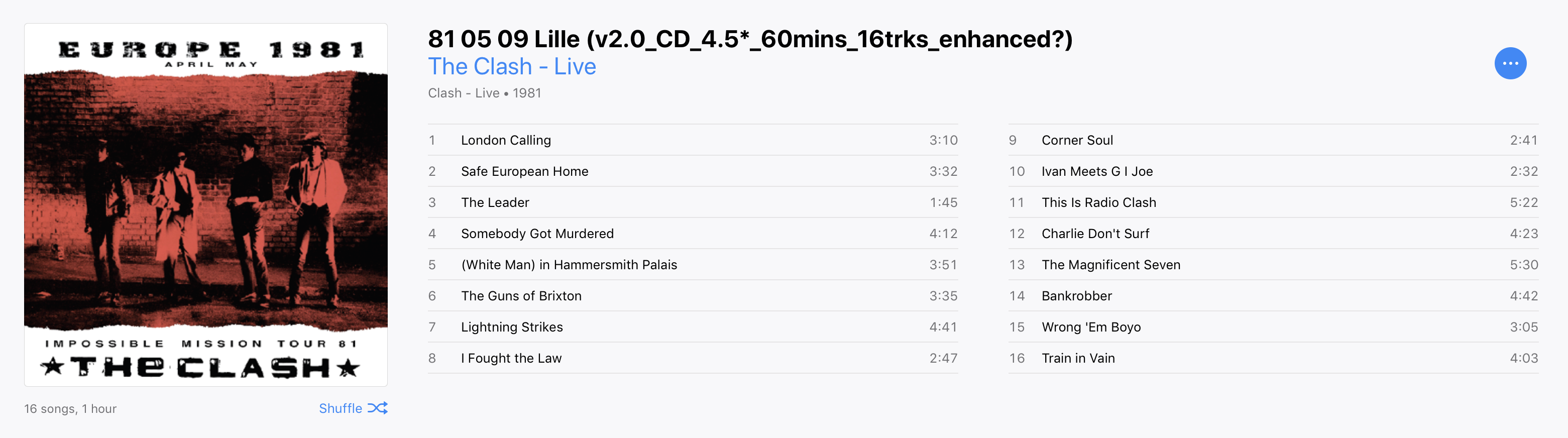 In Lille though, getting its first sighting of The Clash, the audience is noticeably quieter and the band sound tired at times resulting in a good but unexceptional performance. There are a number of very enjoyable highlights though and this coupled with a very good soundboard recording of the majority of the gig, makes this a bootleg very well worth having.