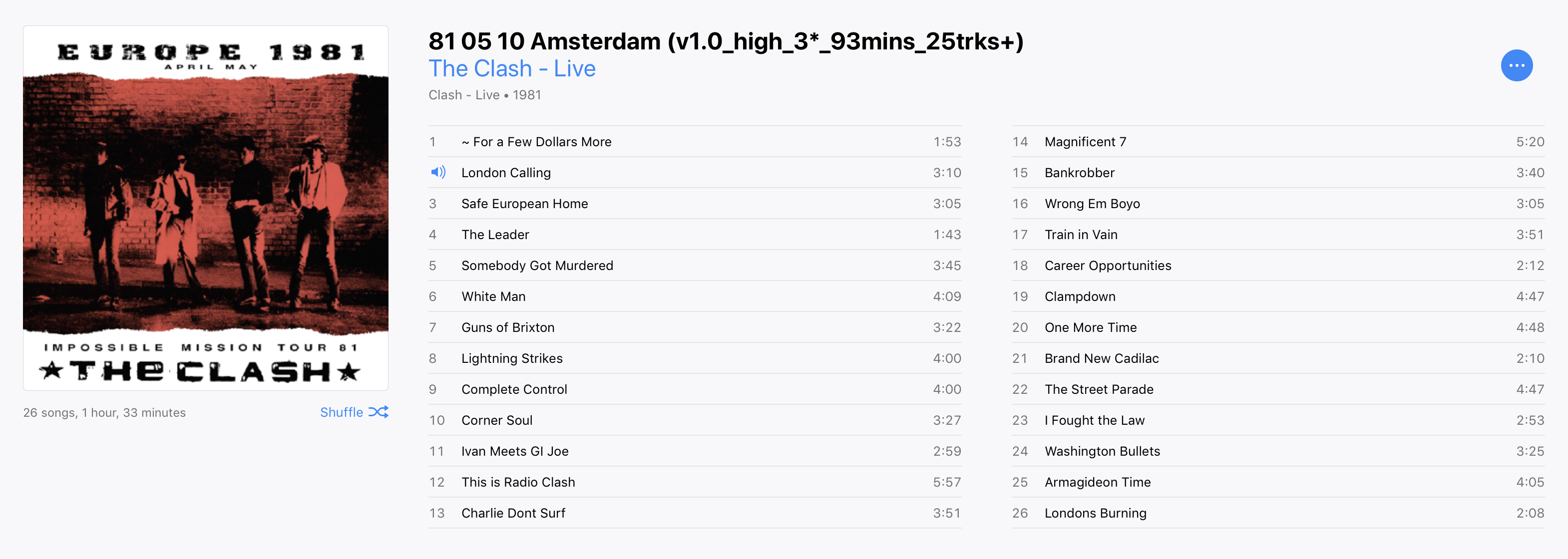 The audience recording begins with the full Morricone intro music, and then the opening chords of London Calling* hammer out. After a lukewarm start where he repeats the first line, you can hear Joe getting fired up, responding to the audience reaction, and getting more and more into it as the song continues.