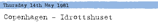 First gig in Denmark (?) where Cliff Richard & Ted Nugent are more popular than Elvis Costello so The Clash didnÌt draw a big crowd. The arena (Idrottshuset) a sportshall was a disaster due to no ventilation and bad acoustics. Intro music was Professor Longhairs In the night.