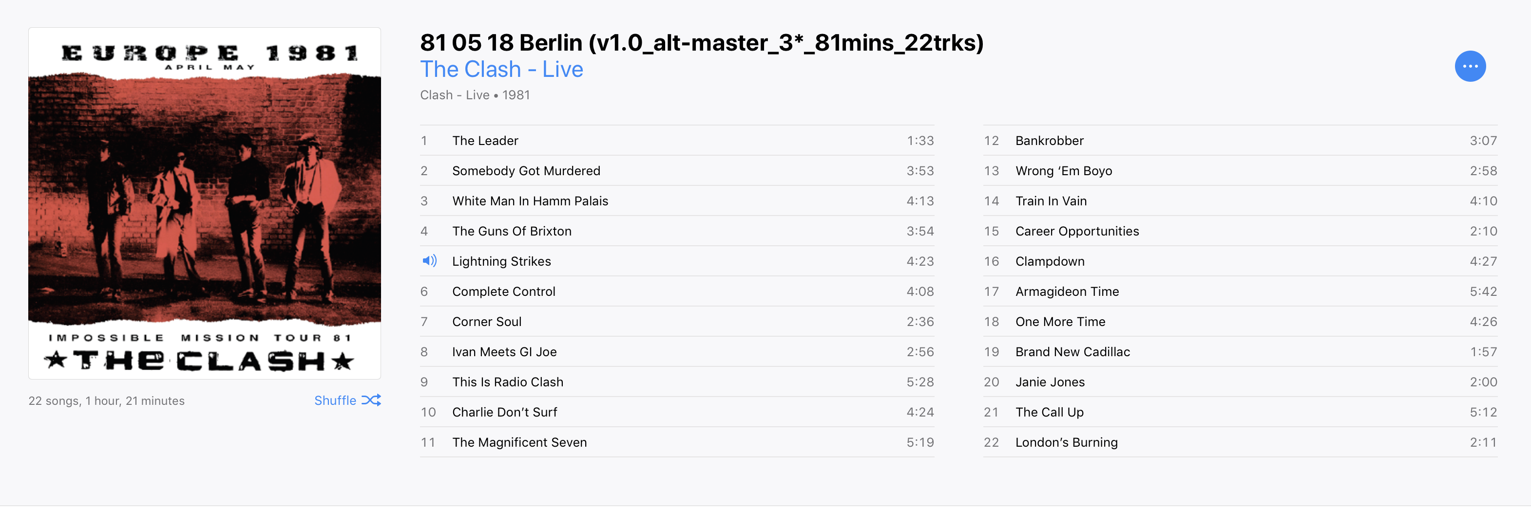 The audience sound lively and appreciative so it's a mystery why The Clash unusually play only one encore, albeit a 6 song one. Armagideon Time runs for the first time into One More Time and then they blast through Brand New Cadillac and Janie Jones. Joe then appears to say "Gute nacht" but Topper has other ideas and beats out an intro to The Call Up.