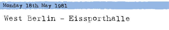 I have some additions to make, I attached my ticket from the March 18th, 1981 gig at the Eissporthalle/Berlin. Also I can offer some b/w pictures I made during that concert (I att. one as an example). The concert on May 13th, 1980 was postponed same date but to the venue "Neue Welt" in the Hasenheide Park (Berlin).