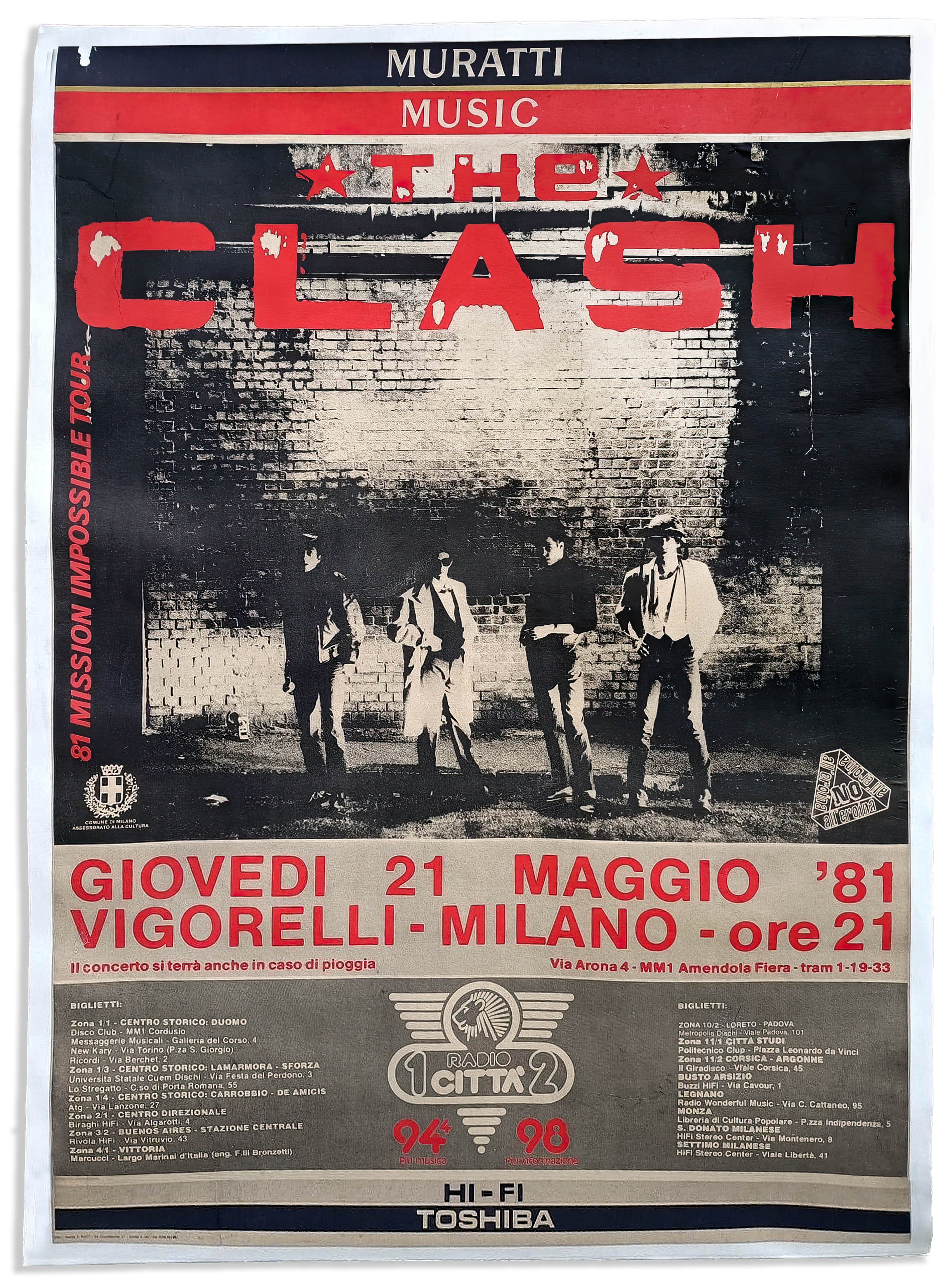 The Clash played in Italy only a handful of times but when they did play, it was always more than a concert; it was an event. In June 1980 they played the now legendary free concerts for the PCI (Italian socialist/communist party) in Torino and in the stunning setting of the Piazza Maggiore in Bologna. In May 1981 The Clash returned to Italy to play in Milano, San Remo and Firenze (a planned Roma concert never came together).