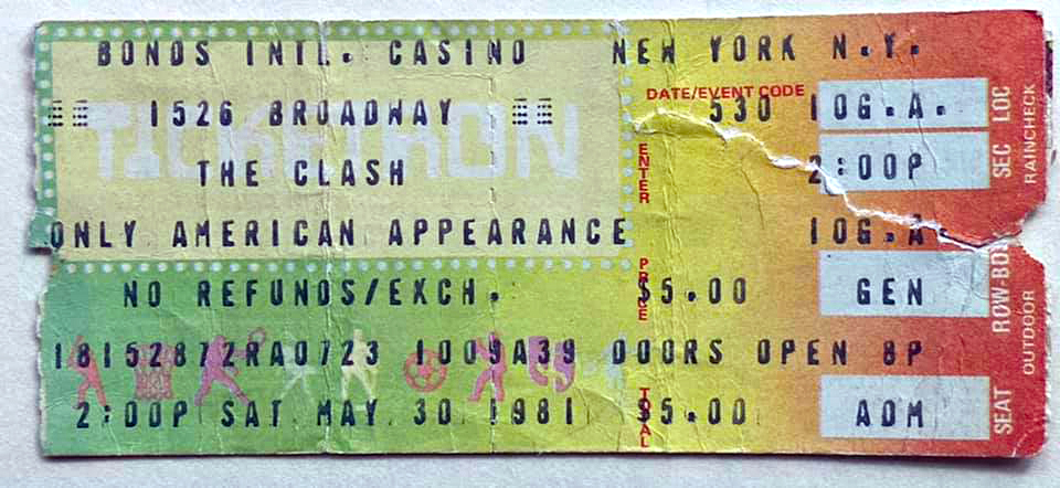 BONDS CASINO, NEW YORK Following their appearance at the Palladium in 1980 The Clash had refused to play in New York unless they could play in a venue they thought suitable, i.e. an unseated dance hall. In February, Bernie and Kosmo had come to New York to seek out a suitable venue and agreed on Bonds which seemed ideal; it could hold 4000 with minimal discomfort (fire exits would prove the problem) but it was comparatively intimate and had character (art deco interior.