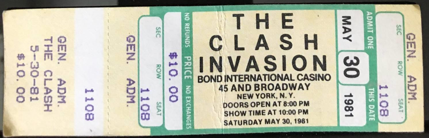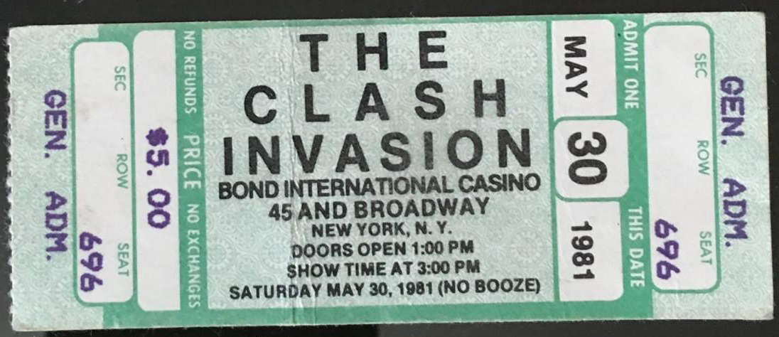 Bond's Casino In May and June of 1981 The Clash played a series of shows at Bond's Casino in New York City. In support of their album Sandinista! they planned eight shows at the Times Square venue, but soon discovered that promoters had wildly over-sold the shows' capacity. Fire marshals shutdown the third performance on Saturday night. In response, The Clash decided to honour every ticket purchased and increased their run at Bond's to 15 shows (or 16 or 17, depending on the source). Of the exhausting ordeal Joe Strummer said, "We took a stand and it nearly killed us," but the move stands as a testament to the band's integrity and love of music. Luckily some of that series was documented, including the June 9th show which was recorded in full for radio broadcast. On the 30th anniversary of the Bond's show this month, the music still sounds every bit as vital. For more information on the Clash's stay at Bond's check out this great resource for period articles or read what Jonathan Lethem has to say about the boys here. A couple news reports and live footage of the shows after the jump.