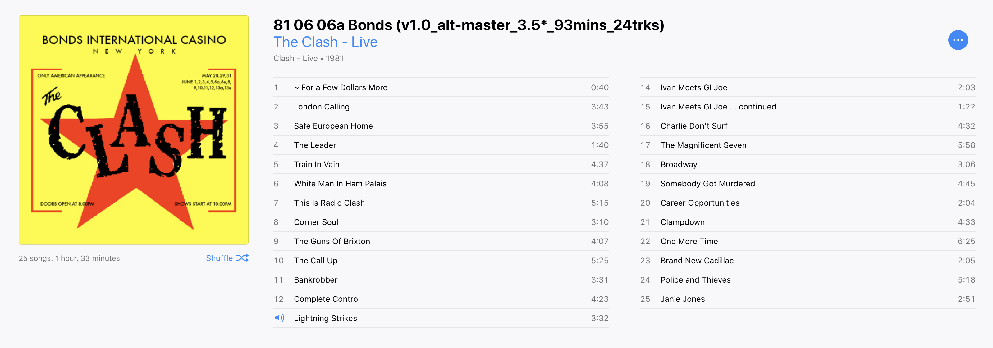 "Ring ring" repeats Joe over the intro to Magnificent Seven; another highlight showcasing in particular Topper's powerhouse drumming. Mick's "You lot" calls come through powerfully and Joe adlibs "now the sun is going down its getting to evening". Joe sings Broadway in a soft plaintive voice over Mick's delicate playing. Somebody Got Murdered literally builds the set through to an intense finale followed by at Joe's request Career Opportunities with Mick and Joe trading then sharing vocals. Then its straight into Clampdown with the recording providing plenty of enjoyable detail in the twin guitar attack. Joe adlibs about college, Geiger counters and Three Mile Island and the powerful performance just lacks an inspired stream of consciousness rant from Joe.