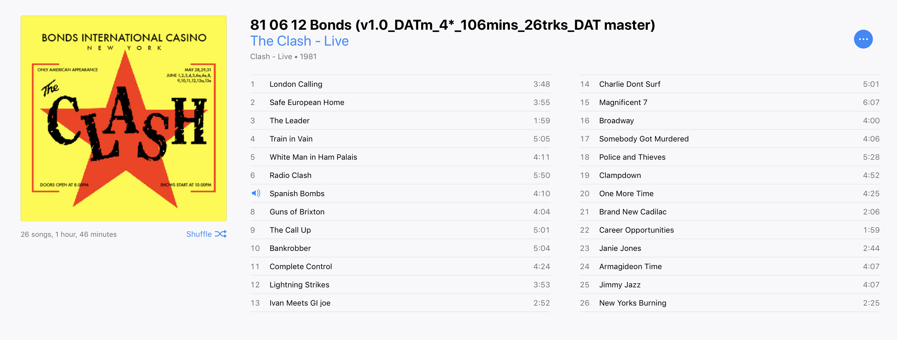 Joe adlibs over the ending of the always-strong White Man in Hammersmith Palais, "Oh please mister just leave me alone" but the rest is unclear. He adlibs again over the ending of an extended Radio Clash; "…without Tom Snyder, calling Walter Cronkite!"