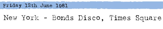 an excellent description of the interior of Bonds J. Blocher writing in a fanzine gives an excellent description of the interior of Bonds and the experience of seeing The Clash there: "The doors opened at 8pm, we went up a carpeted spiral staircase surrounded by barbed wire and Mooseheads. We went into a large lobby and bar, with Clash concession stands. Through a large bank of double doors we located the dance floor, strobing lights - stunning glow in the dark things, half inflated silver spacemen hanging through trap doors in the ceiling. The dance floor itself was huge with recessed balconies at 2 sides to handle the large number of techies apparently required to keep all the lights flashing and the mikes feeding back. The facilities at Bonds were dance or drop! There was absolutely no seating anywhere."