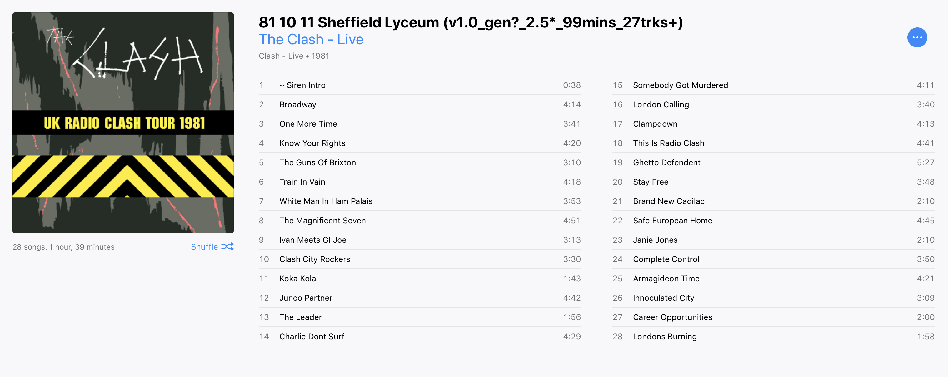 The recording begins with the sirens intro and chat near the taper. "Good evening and welcome to the Sheffield Lyceum, ..yeah this is The Clash here" says Joe. But the audience could be forgiven as the band start with the gentle intro to Broadway. The performances are good and the highlights of the main set are White Man In Hammersmith Palais, Magnificent Seven, "blast from the past" Clash City Rockers, a passionate Koka Kola and an imaginative Charlie Don't Surf.
