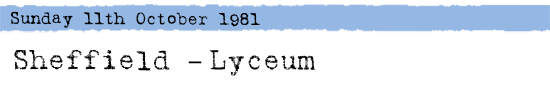 Sheffield Lyceum 11 Oct 1981 sunday .can confirm this.i went to bridlington on the sat and got in at sheffield on the sunday for free,bouncer let me and girlfriend in. nudger