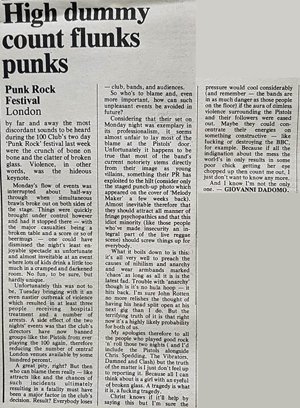 They played like dogs straining at a collective leash. Siouxsie was an interesting noise for five minutes... and a bore for fifteen. Subway Sect were a musical Kafka novel... and had some good songs. Sex Pistols were rough... and played a horrible version of Substitute.