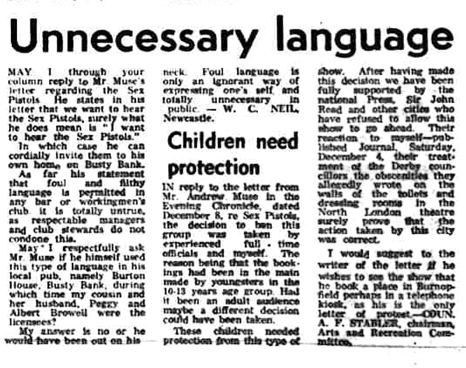 W. C. Neil, Newcastle: Condemns foul language, saying it is ignorant, unnecessary in public, and not tolerated in respectable clubs; Coun. A. F. Stabler: Defends banning the Sex Pistols to protect children, insisting the decision was justified and widely supported.