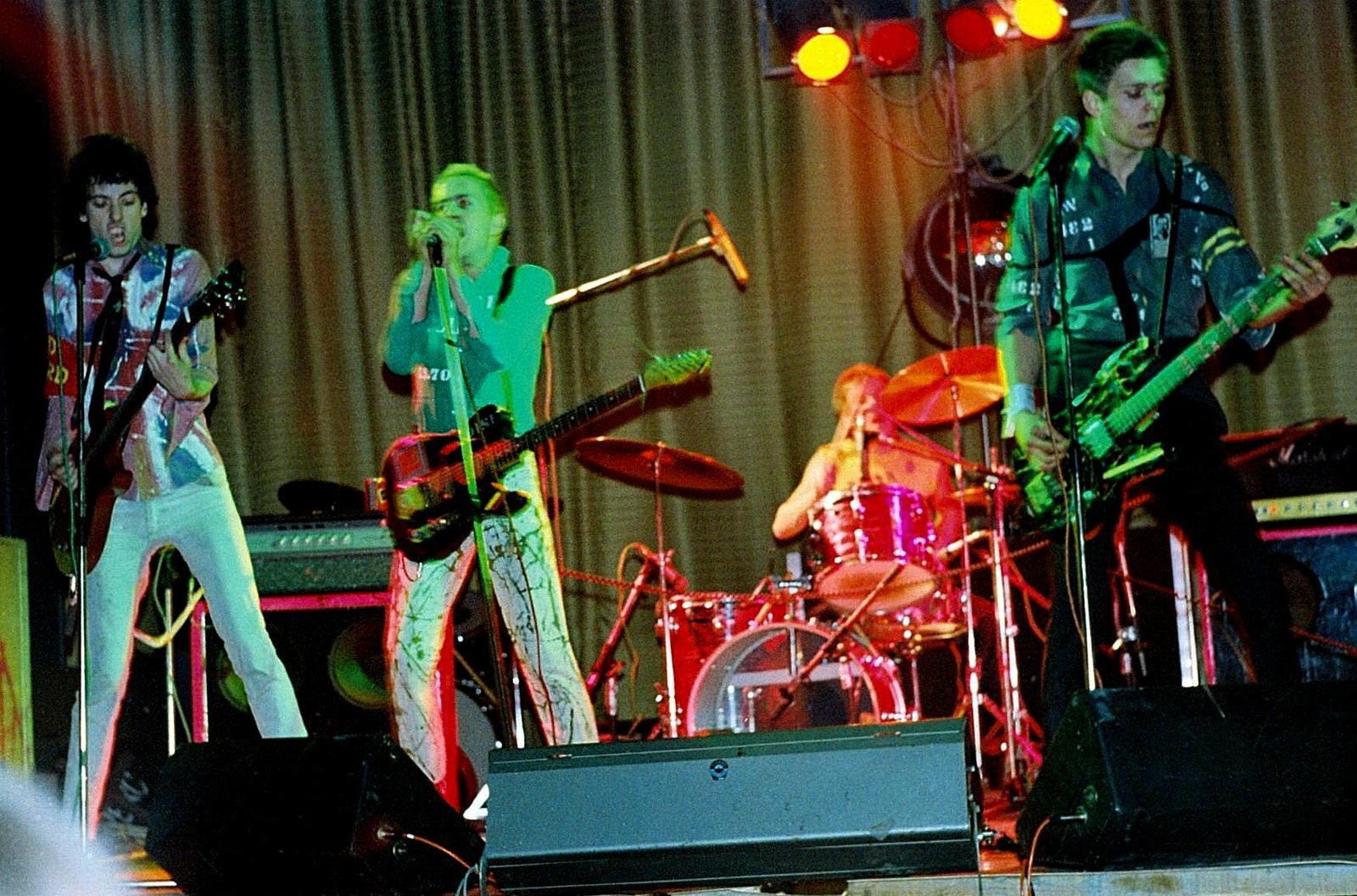 If Johnny was uncharacteristically quiescent, the others almost made up for it. Glen Matlock seemed to be playing his bass in a blur of knee jumps. Steve Jones practised calisthenics between savaging his guitar — he's beginning to justify the legend Guitar Hero sprayed on his amp. And Paul Cook kept right in there with his solid drumming and torn porno T-shirt.