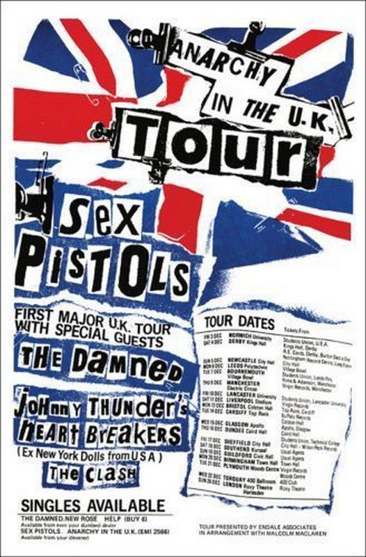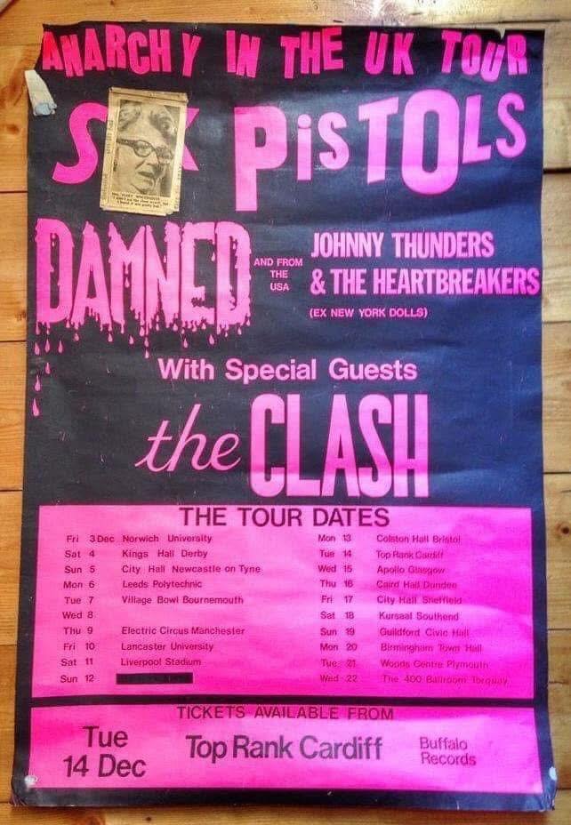 Tour dates have been rearranged and as Sounds goes to press they are: this week — Tuesday, Caerphilly Castle Cinema; Wednesday, Lafayette’s, Wolverhampton; Friday, Market Hall, Carlisle; Saturday, Electric Circus, Manchester. Next week: 20th, Bingley Hall, Birmingham; 21st Plymouth, Wood Centre; 22nd Penelope’s, Paignton; 23rd Plymouth, Wood Centre. For all the gigs, except Manchester where the Buzzcocks are again supporting, the bands playing are the Pistols, The Clash and the Heartbreakers.