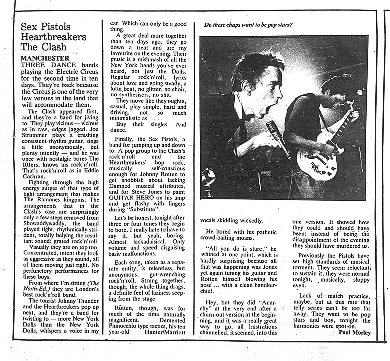 “To turn up to a Sex Pistols show nowadays is to make a statement to the world that you care about rock ’n’ roll and don’t give a Bill Grundy what the yellow-press thinks. And enough kids in Manchester, God bless ’em, were prepared to do just that, almost filling the place.” (Jonh Ingham, SOUNDS, 25 Dec 1976) .