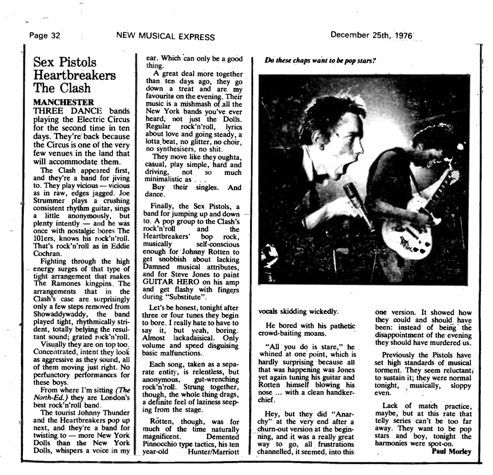Finally, the Sex Pistols, a band for jumping up and down to. A pop group to the Clash's rock'n'roll and the Heartbreakers' bop rock, musically self-conscious enough for Johnny Rotten to get snobbish about lacking Damned musical attributes, and for Steve Jones to paint Guitar hero on his amp and get flashy with fingers during Substitute.