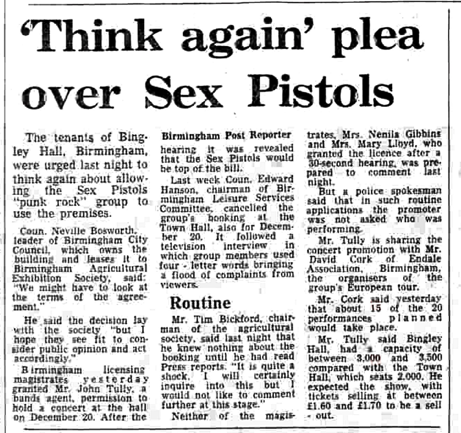 Birmingham Post Reporter — A concert by the Sex Pistols “punk rock” group was cancelled by the tenants of Bingley Hall, Birmingham, today.