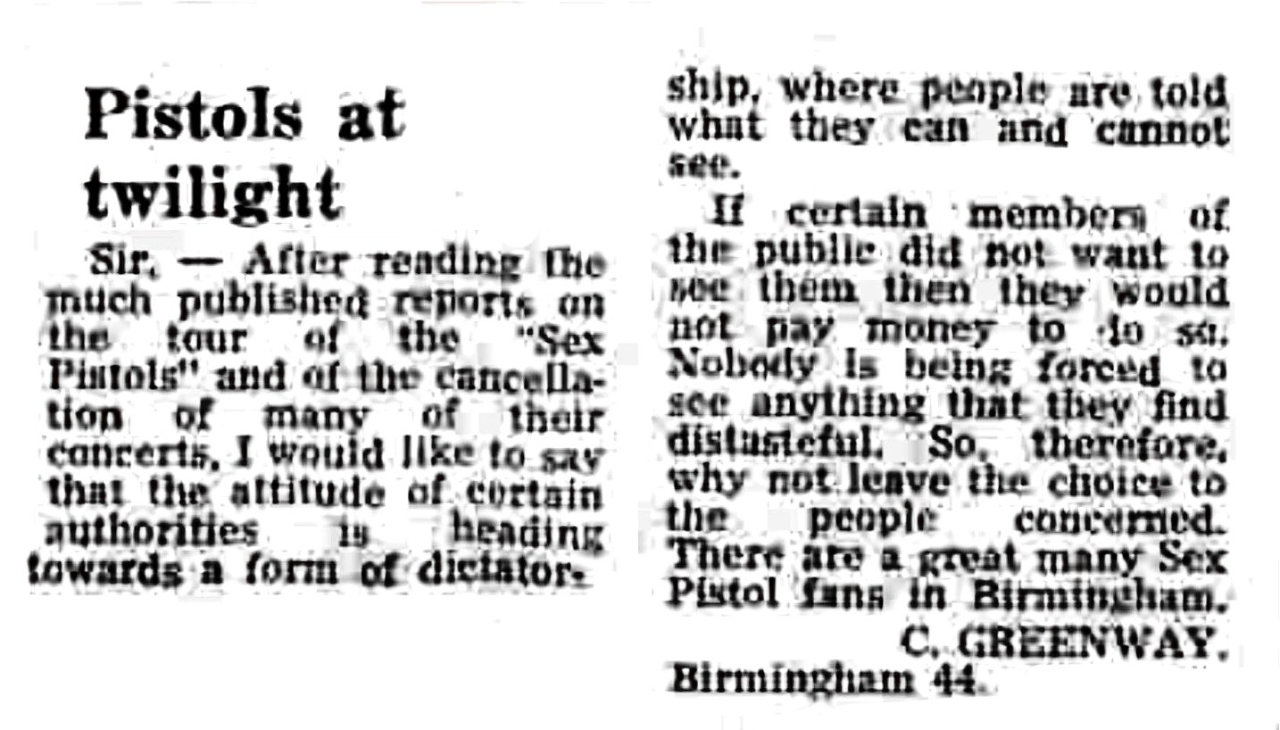 One reader, Derek Ford of Solihull, shot back: “I must comment on the council’s action in banning the Sex Pistols… They will not subject the people of Birmingham to such unadulterated filth. Of course the council turns a blind eye to the porn that is on in many of our cinemas, and makes no bans on football clubs whose supporters turn parts of our city into a battleground.” (Birmingham Mail, 13 December 1976).