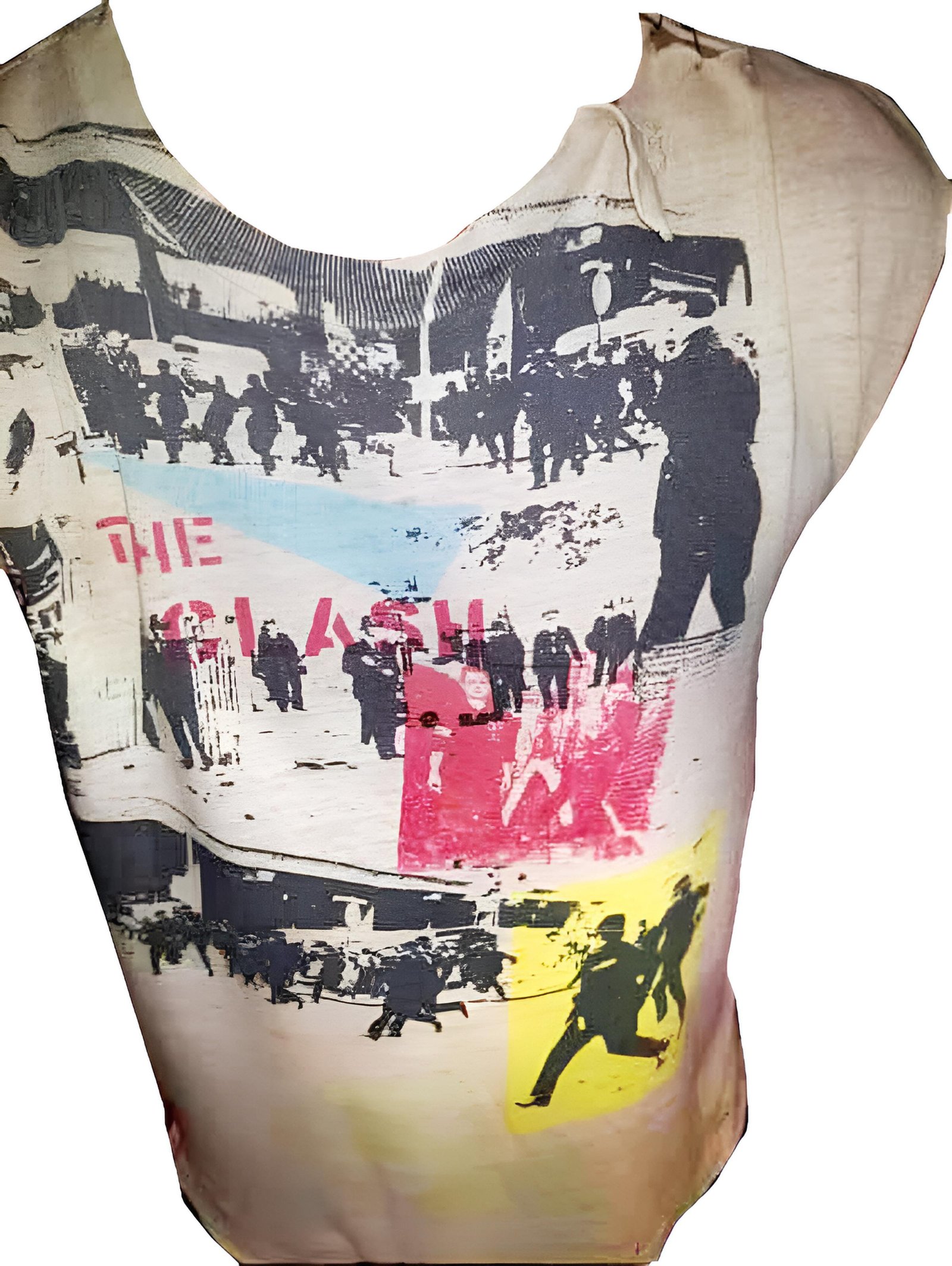 Anarchic messages on punk tee shirts. Below, bloodstained youths escape from Sloane Square by tube.