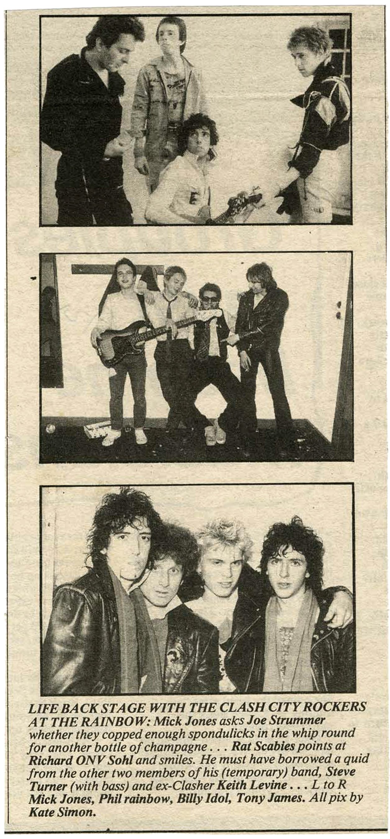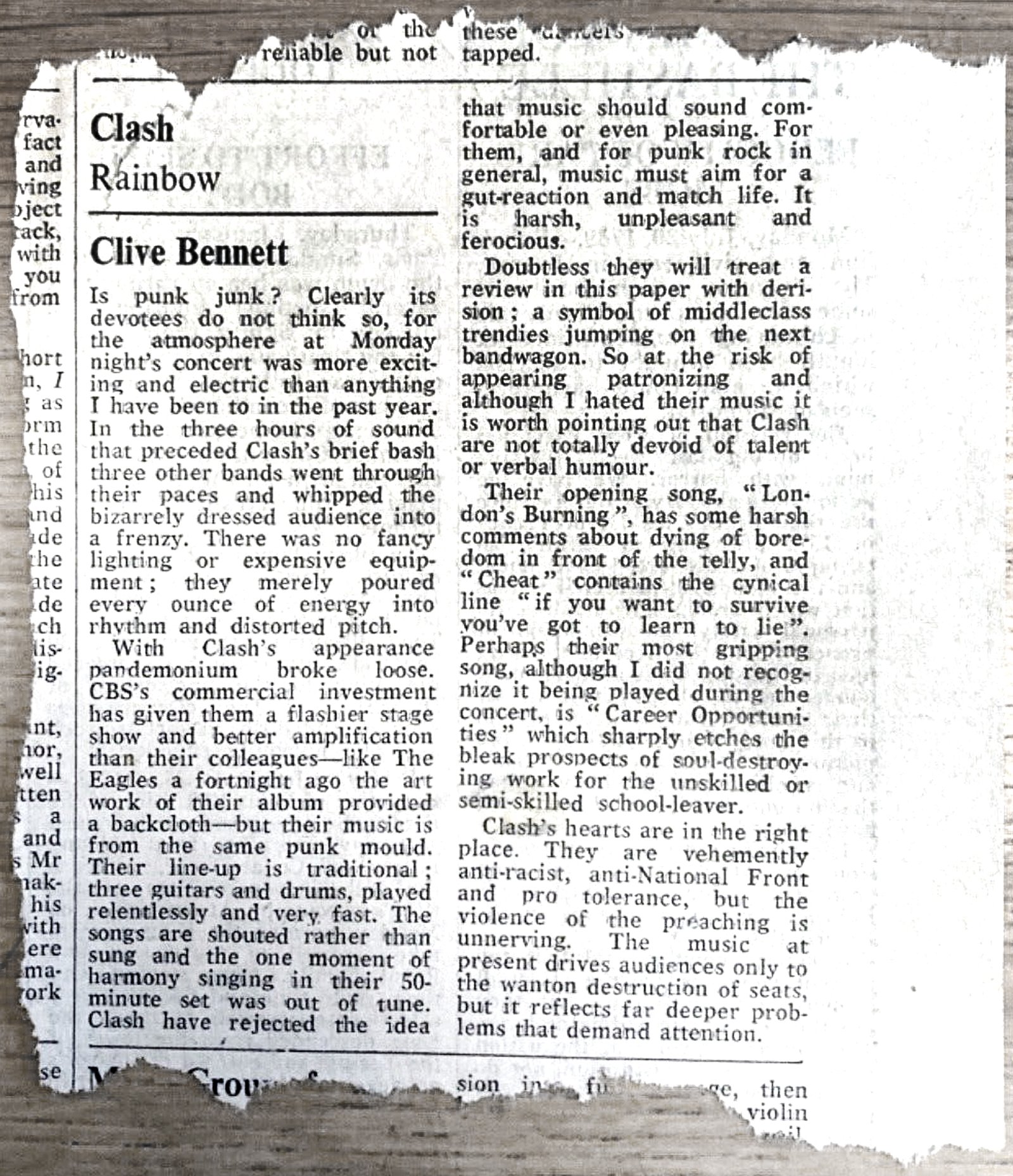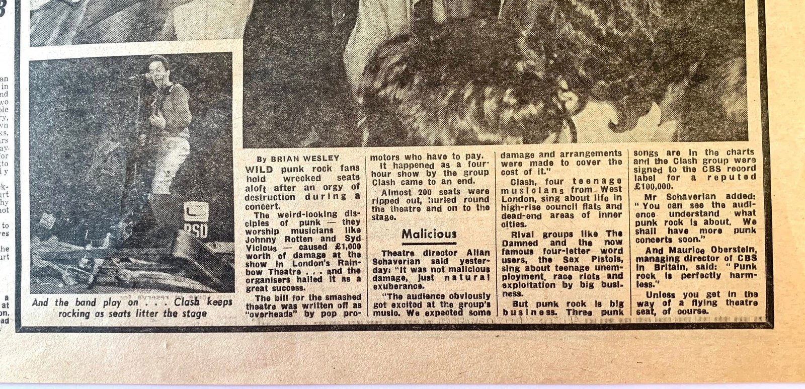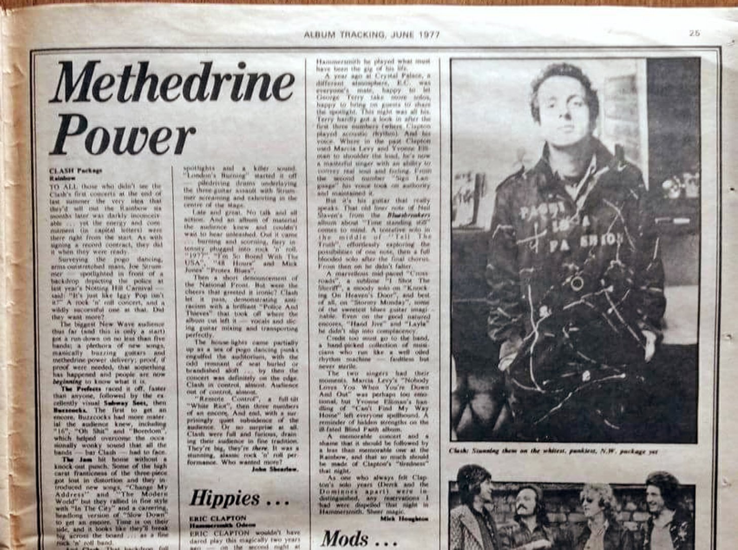 As long as the resultant debris was stacked neatly along the front of the stage, The Clash themselves remained unperturbed, while in the wings the Rainbow management likewise looked on apparently unalarmed. After all, it had been previously agreed that any damage would be paid for in full by The Clash management.