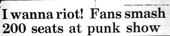 A few months ago it was The Hot Rods who'd occasioned the stall-trashing, and not long before that I recall seeing a particularly awesome picture of seat destruction after an Alex Harvey gig at the Glasgow Apollo.