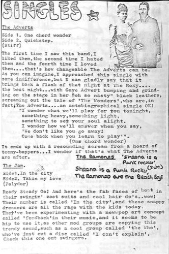 SINGLES . The Adverts : Side 1. One chord wonder ; Side 2. Quickstep ( Stiff ). The first time I saw this band, I liked them, the second time I hated them and the fourth time I loved them....that's how changeable The Adverts can be . As you can imagine, I approached this single with some indifference, but I can gladly say that it brings back a flash of that night at The Roxy .... the best night... with Gaye Advert bumping ahd grinding on the stage in her "oh so nasty" black leathers, screaming out the tale of 'The Wonders' , who are, in fact, The Adverts .... an autobiographical single OK! . "I wonder what we'll play for you toningh-t, something heavy, something light, something to set your soul alight. I wonder how we'll answer when you say, 'We don't like you go away! Come back when you learn to play!'" ( One chord wonder ). It ends up with a resounding scream from a hoard of teeny-boppers... I wonder if that's what The Adverts are after .