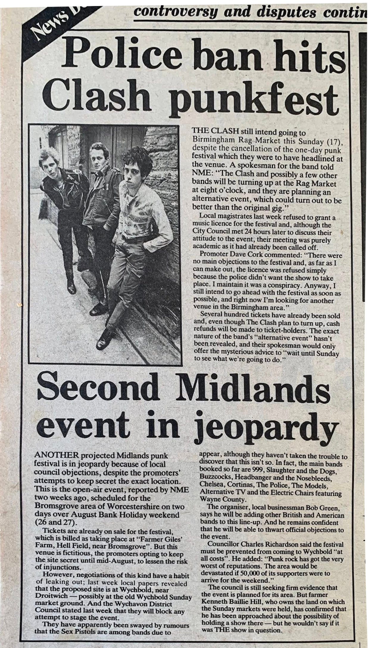 ANOTHER projected Midlands punk festival is in jeopardy because of local council objections, despite the promoters attempts to keep secret the exact location. This is the open-air event, reported by NME two weeks ago, scheduled for the Bromsgrove area of Worcestershire on two days over August Bank Holiday weekend (26 and 27).