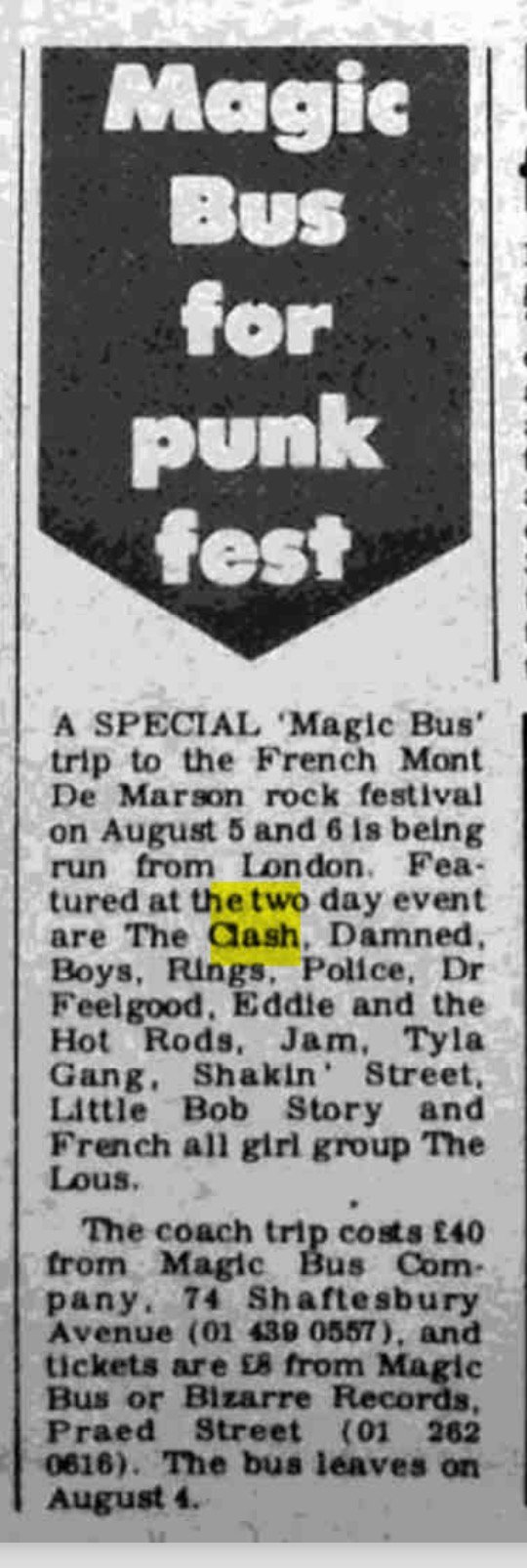00:26:45 - 00:27:13 It is perhaps for the best; the Pistols are among the most uncontrollable. And in the end, Marc Zermatti does rather well anyway. He has more than one trick up his sleeve. And above all, The Clash agree to come. So, on paper, the bill is impressive. On the English side: The Clash, The Police, The Jam, The Damned - excuse the understatement. On the French side: Stinky Toys, Bijou, Dr. Feelgood - enough to draw a crowd.