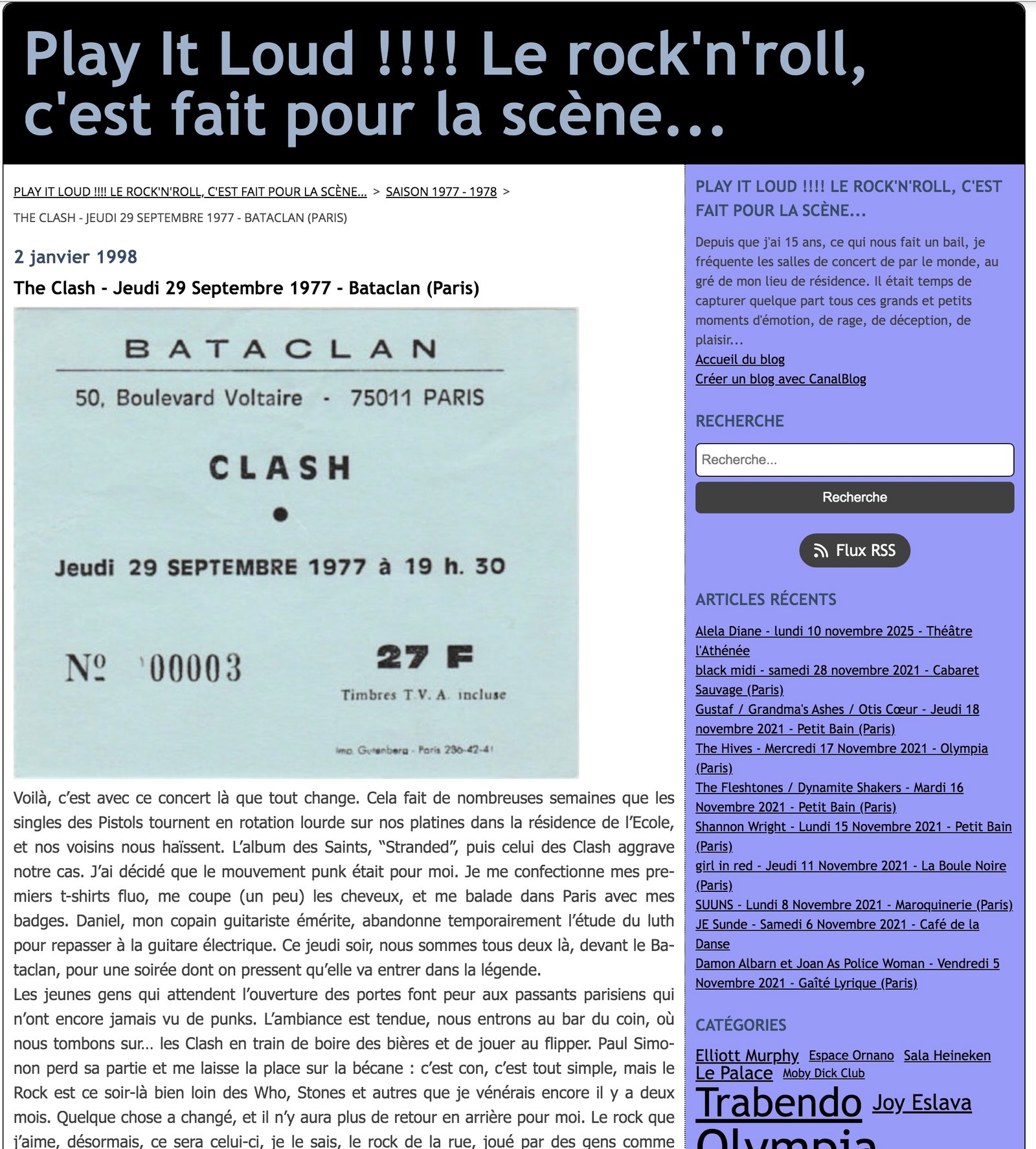 Auteur : Éric | Publication : Une vie de concerts | Date : 25 octobre 2015 (Concert du 29/09/1977) | Lien : uneviedeconcerts.fr | Titre : The Clash - Jeudi 29 Septembre 1977 - Bataclan ( Paris )