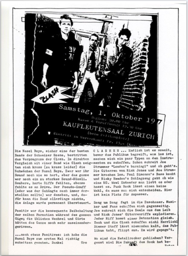 CLASH Saturday, October 1, 1977 Start: 8:00 PM Box Office & Doors Open: 7:30 PM KAUFLEUTENSAAL ZURICH (near Pelikanplatz) Admission in advance: Fr. 15.-