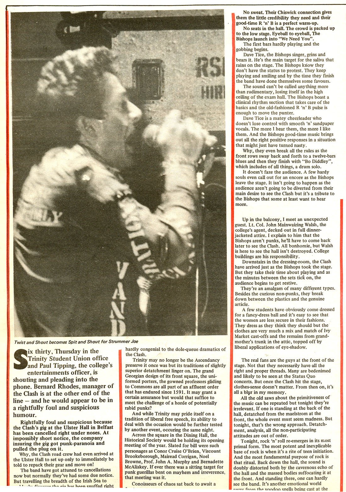 — Two separate live reviews of The Clash's performance at Trinity College in Dublin on 21 October 1977 by Pete Price and Stephen Rapid.