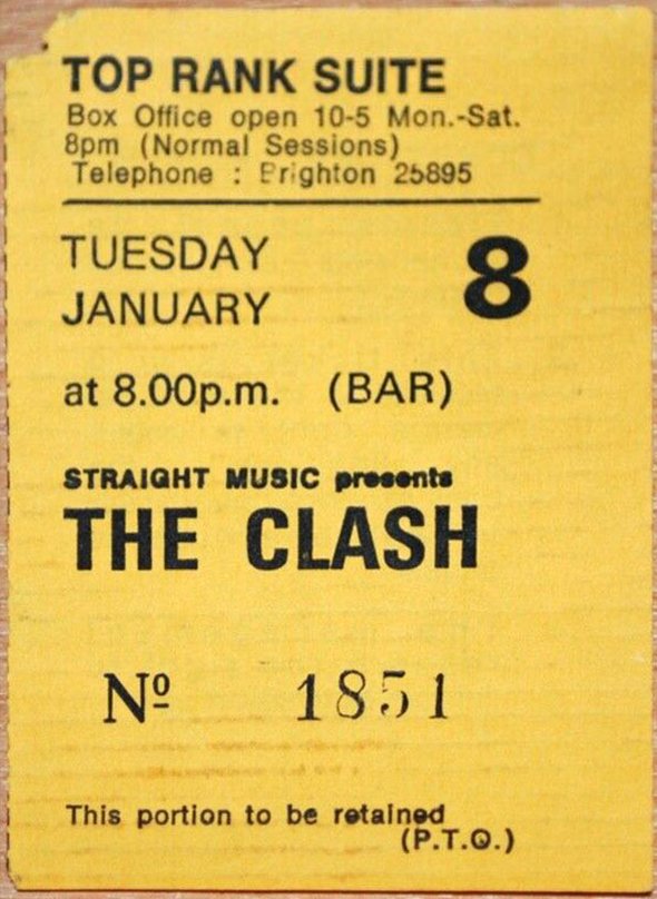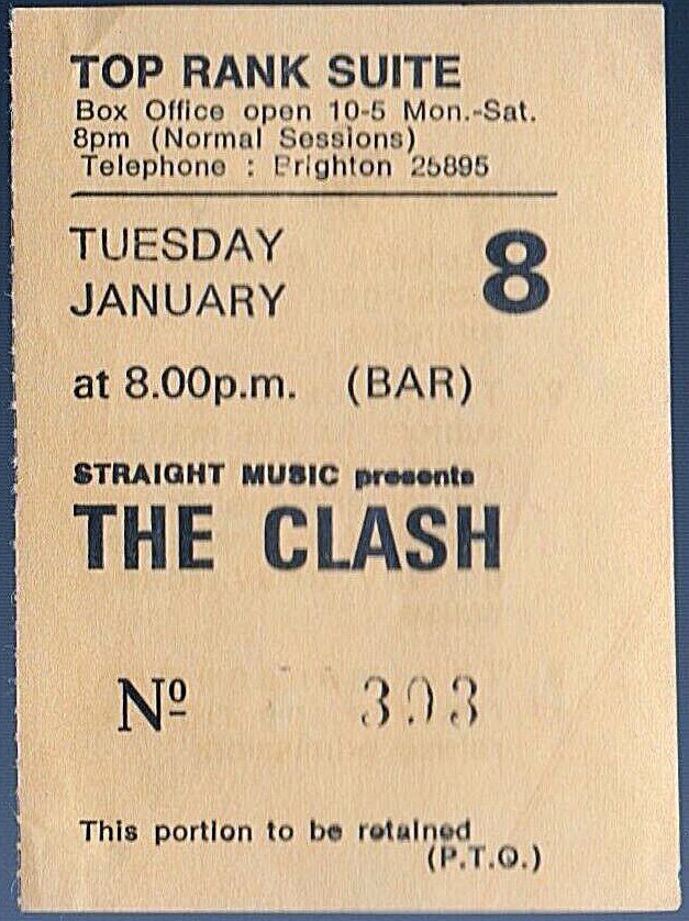 Robin Tate -- Tonight saw The Clash playing their 3rd gig of the 16 Tons Tour. Here's my original ticket [#339] I kept from the Brighton Top Rank, for this the 8th of January 1980. facebook
