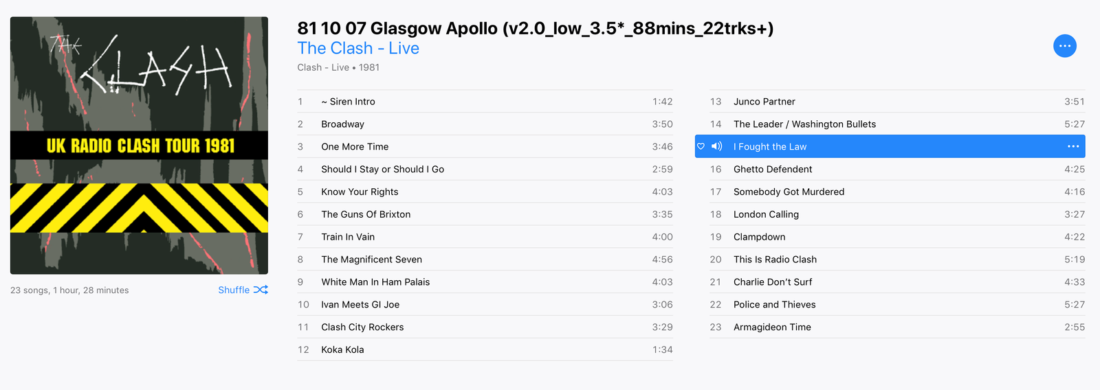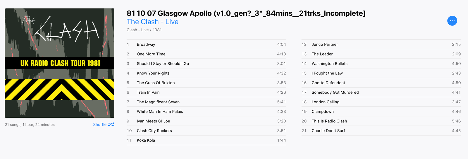 "Welcome to the 1981 Clash stand at the Apollo" shouts Joe to the Glasgow faithful as The Clash return again to play two nights at the (in)famous Glasgow Apollo. The accounts from people at the gig that follow testify to the quality of The Clash's performance preserved by a decent audience recording (sadly incomplete)
