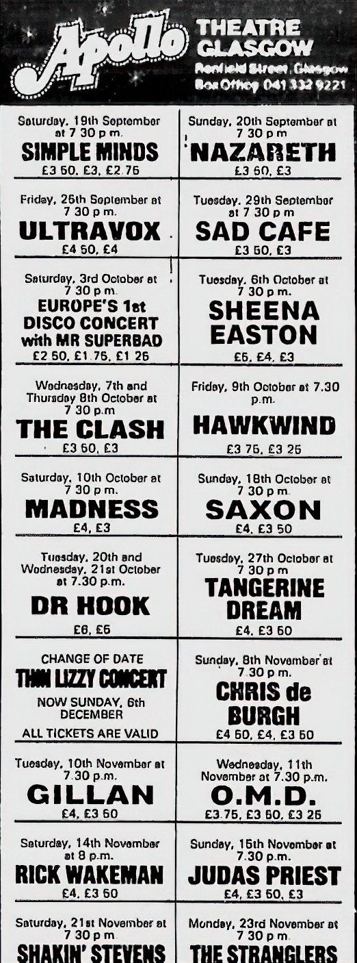 Glasgow Apollo newspaper advert from 1981 covering gigs from September thru till November